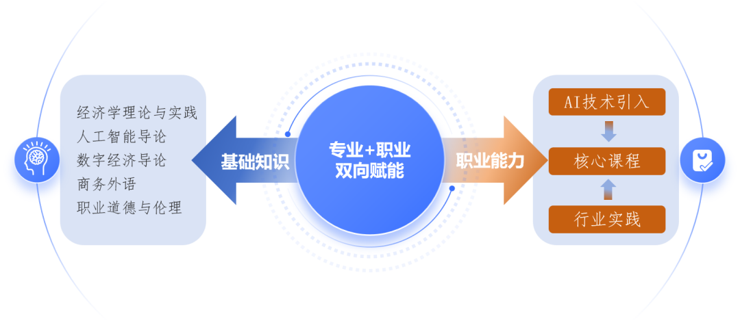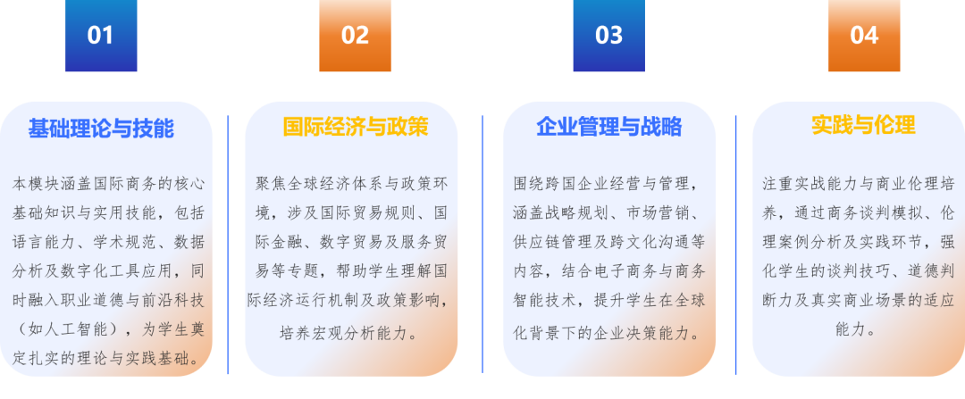 课程设置结合人工智能时代要求,从素质品格、管理理念、技术应用、社会实践等层面进行系统性设计和优化,构建“专业+职业”双向赋能的培养模式,包含基础理论与技能、国际经济与政策、企业管理与战略、实践与理论四大课程模块,以契合新时代管理人才的最新职业发展诉求。